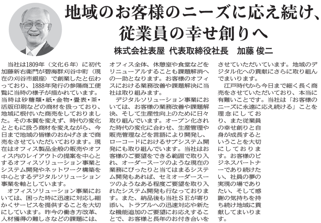 <<2025年9月30日 中部経済新聞 【西三河のオンリーワン企業トップに聞く我が社の強み】に当社が掲載されました>>